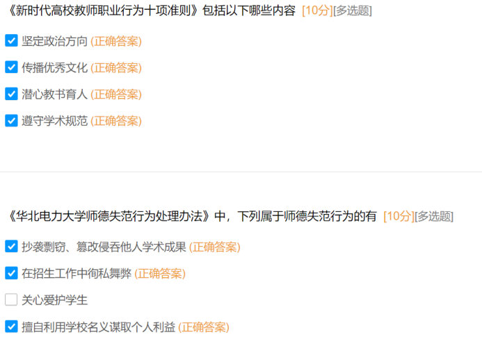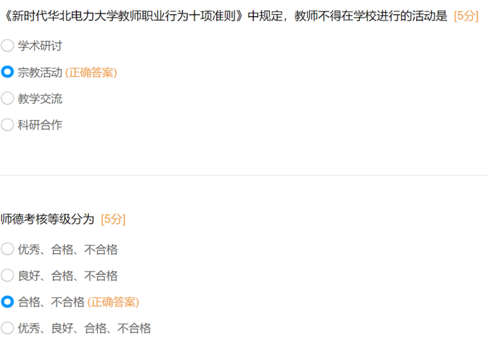 此次知识问答聚焦师德师风核心要求,题目内容紧密围绕《新时代高校教师职业行为十项准则》《新时代高校教师职业行为“十不准”》及《k漫画 师德失范行为处理办法》等文件,涵盖教师职业行为红线、师德失范行为认定与处理、师德考核等级与程序、廉洁自律要求等核心模块,全面检验教师对师德师风规范的掌握程度。通过问卷反馈来看学院大部分教师对师德的基本准则和行为底线有着较为清晰的认识,在日常教学和工作中能够自觉遵守相关规定。