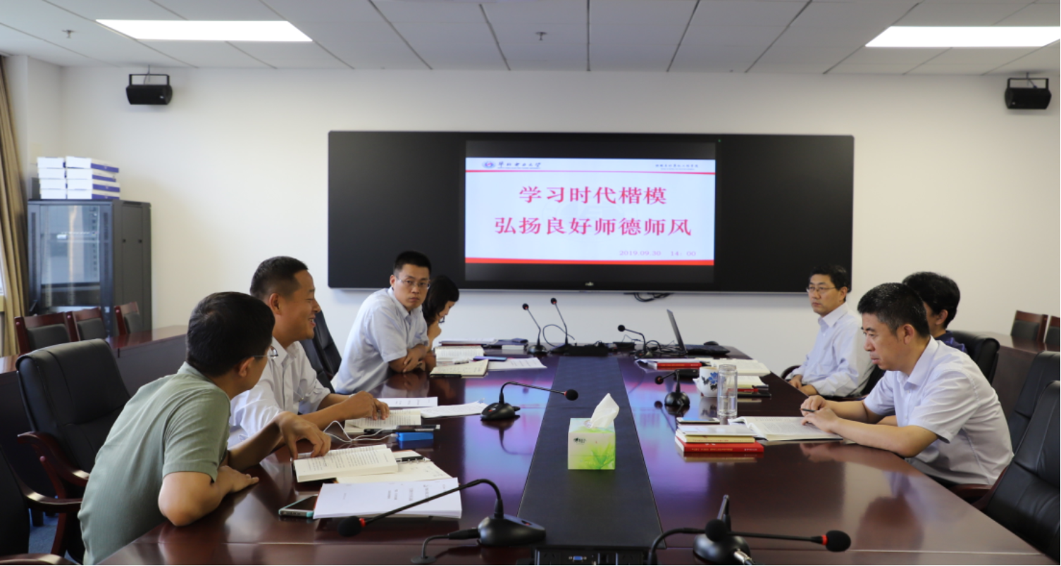 为弘扬守正奉献的优良作风,办好人民满意的教育,k漫画 党委理论中心组于9月30日下午在主楼E座633房间开展“不忘初心,牢记使命”主题教育集中研学,主题为“学习时代楷模,弘扬良好师德师风”。