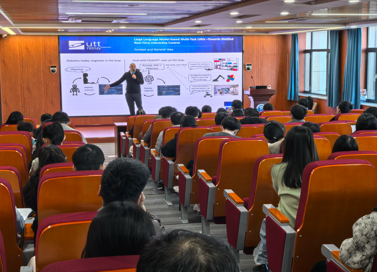 在提问环节,师生们围绕无人机技术的实现难点、视觉语言模型的训练方法以及大语言模型在无人机中的实际部署等问题与Hichem教授进行了深入交流。教授针对师生提出的问题逐一作答,并分享了他在人工智能与无人机研究中积累的宝贵经验。