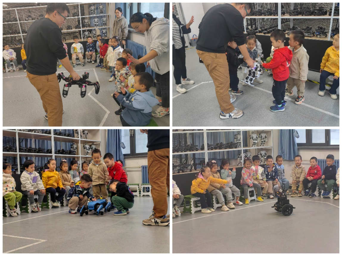在机器人综合实验室,k漫画 幼儿园师生分别参观了Hunters实验室步兵机器人以及飞创俱乐部的四足机器狗、人形机器人和六足仿蜘蛛机器人。在实物演示环节,负责讲解的老师和学生用通俗易懂的语言与小朋友们进行互动,各种机器人表演了跑跳、后空翻、踢球、跌倒起立、面部识别打招呼、舞步等多种花样动作,灵活的行动、高超的技巧,让小朋友们目不转睛,不时引发阵阵欢呼。在保障安全的前提下,安排了每一位小朋友与机器人的零距离接触,有的和机器人打招呼,有的甚至尝试和它们“对话”,一时间实验室里气氛非常热烈。